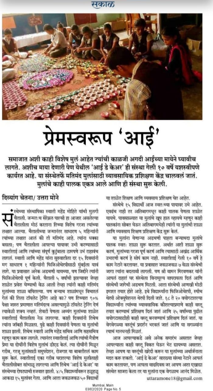 Aai Day Care Centre was born out of a shared dream — the dream of creating a nurturing and empowering space for special children. On June 15, 2010, a dedicated group of seven parents came together in Pen with a common goal: to provide their children with the care, support, and opportunities they truly deserve. What began as a heartfelt initiative has grown into a beacon of hope for many families, offering a safe, inclusive environment where every child is celebrated and encouraged to reach their fullest potential.